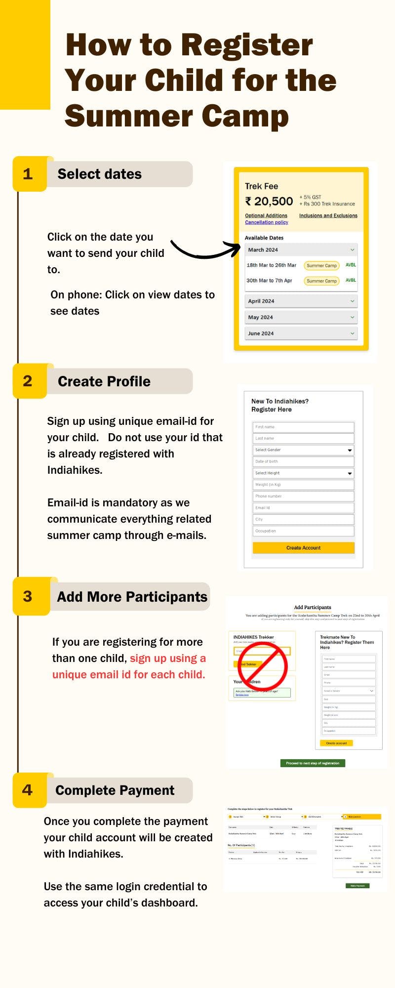 Registering for the youth camp trek: Registering for a youth camp trek is slightly different from other treks. We are working on making the process easier for you; meanwhile, refer to these steps.